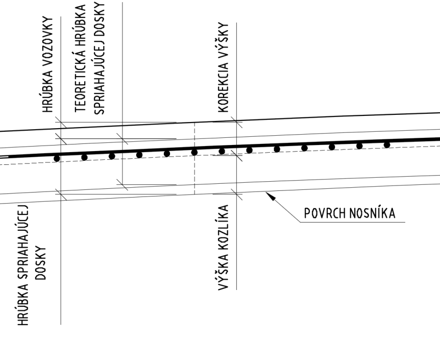 MRIEŽKA KOZLÍKOV – pri zvolení tejto možnosti program vykreslí do tabuľky pre každý nosník výšky stabilizačných kozlíkov pre hornú výstuž spriahajúcej dosky. Vzájomné vzdialenosti sú počítané podľa nastavenia „Vzdialenosti počítania/kreslenia hrán, 3D/2D rezov“ v „Options“ záložke “Výpočet a kreslenie/Iné”. V tabuľke sú vypísané potrebné výšky kozlíkov pre príslušnú vzdialenosť od začiatku nosníka. Pri generovaní kozlíkov je potrebné zadať hodnotu „Korekcia výšky“. Táto hodnota predstavuje výšku ktorá bude odpočítaná od teoretickej vzdialenosti povrchu nosníka od povrchu vozovky. Mala by teda zahŕňať: