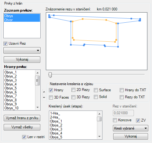 Stlačením tlačidla vykonaj v časti „Prvky z hrán“ program vykoná kresliacu/mazaciu funkciu pre vybrané Prvky zo zoznamu prvkov. Prvky budú vykreslené tak ako boli zadefinované z hrán v celej dĺžke každej hrany. Pokiaľ si prajeme vykresliť iba určitý úsek (menší) ako sú definované hrany v prvku je toto možné vybraním príslušnej hrany z okna „Kreslený úsek (etapa)“.