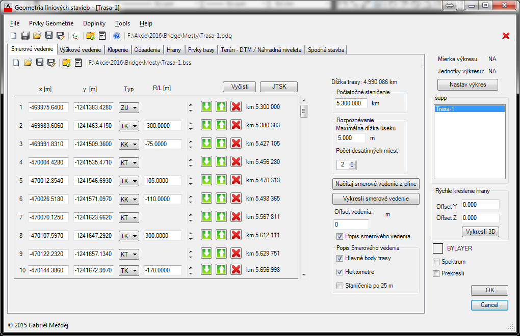 Po načítaní trasy je potrebné dať vykresliť a skontrolovať zhodnosť vytvoreného smerového vedenia s podkladom. V prípade, že prechodnica alebo oblúk sú vykresľované na opačnú stranu, je potrebné polomer oblúka alebo dĺžku prechodnice v danom mieste zadať so znamienkom mínus. Ak chceme pridať alebo ubrať bod použijeme tlačidla v príslušnom riadku. Súradnice je možné zadať aj vybraním bodu z výkresu. Nastavíme kurzor na riadok, kde chceme súradnice vypísať a stlačíme kláves F3. Po stlačení sa okno zavrie a vyzve nás na vybratie bodu. Po vybraní bodu sa súradnice bodu (lokálneho súradného systému) vypíšu do riadku. Typ hlavného bodu, polomer resp. dĺžku prechodnice vpíšeme manuálne.
